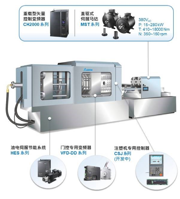 臺達直驅式永磁同步伺服馬達是專為低轉速、高轉矩應用所設計。可同步作業、加減速響應快,能夠縮短產品制作時間,提升產能。直驅控制,精準掌握熔膠量,并以穩定的轉速提升加纖復合產品的良率和質量。除了具備高效率、高精度、等特性,出軸亦彈性多樣,能搭配多種軸套以滿足不同需求與應用。 機身結構穩固、安裝容易、維護方便、產品壽命長、低噪音且有效節能,以良好的優勢取代液壓馬達或減速機。