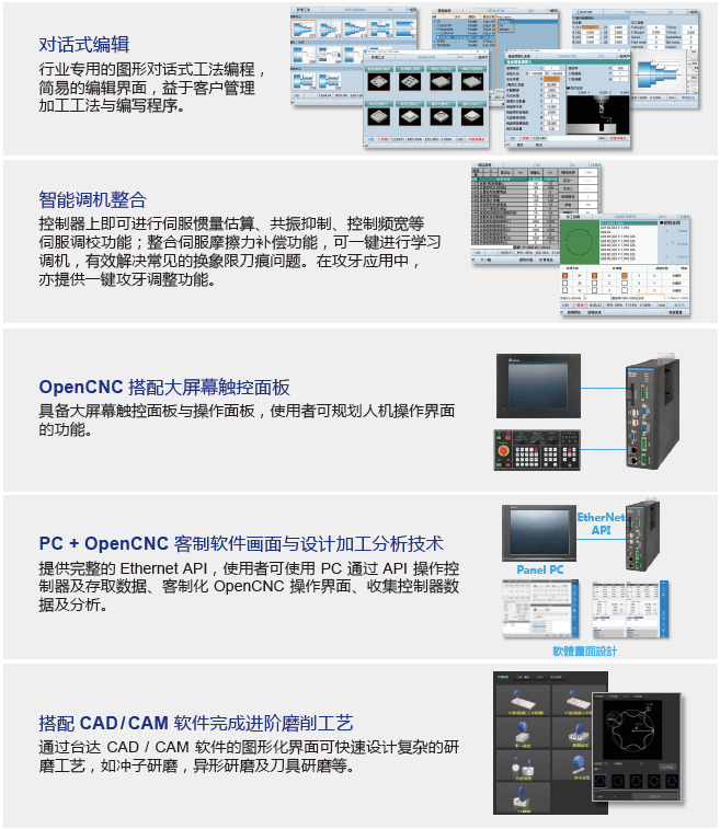臺達新一代CNC B系列數控系統,根據客戶需求和市場趨勢,整合HMI 平臺操作界面,可依照企業及行業需求,彈性化客制操作界面;并可搭配臺達伺服驅動器 ASDA-A3 / ASDA-B3 系列、永磁主軸系統及交流電機驅動器驅動主軸,以及通訊網絡 DMCNET 等進行高速數據傳輸及控制,達到控制機床的電機定速、定轉矩與精密定位。